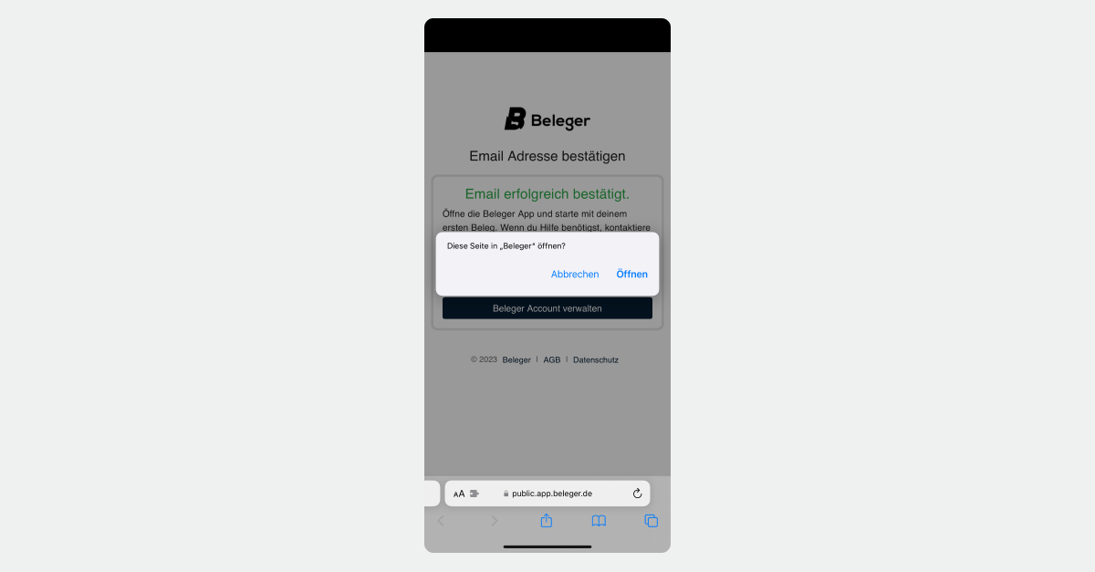 Du erhältst nach der Eingabe deiner persönlichen Daten einen Link zur Bestätigung an deine Email Adresse. Tippe auf den Link, im Anschluss öffnet sich ein Popup auf dem Smartphone “Beleger App öffnen”. Tippe auf “Öffnen” und die Verifizierung ist hiermit abgeschlossen.