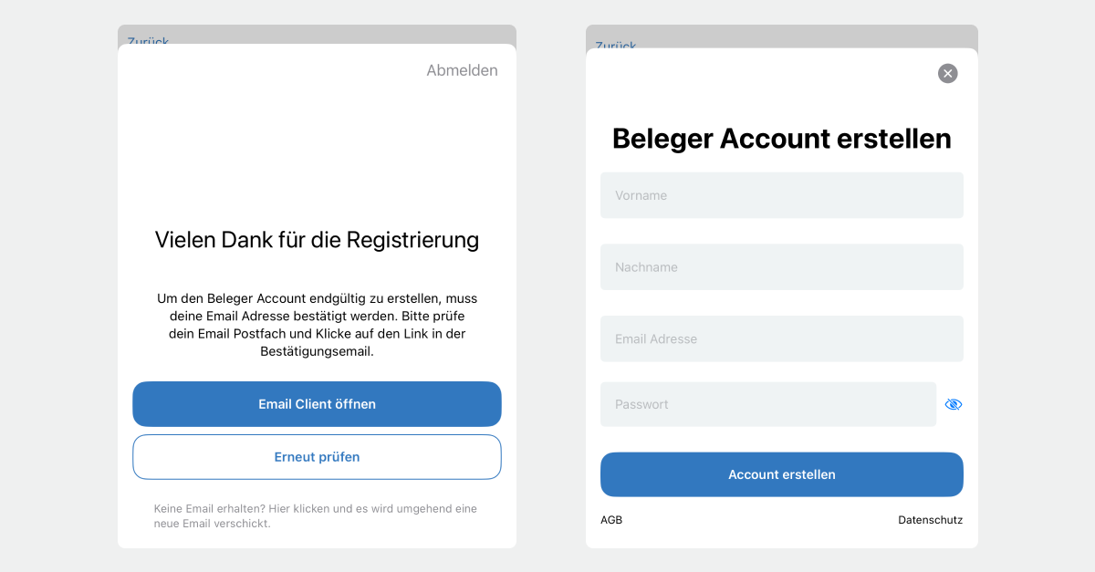 Öffne ganz einfach die Beleger App, tippe auf den Button "Account erstellen" und ergänze deine persönlichen Daten. Verifizieren anschließend deine Email Adresse und du kannst die Einrichtung der App abschließen.